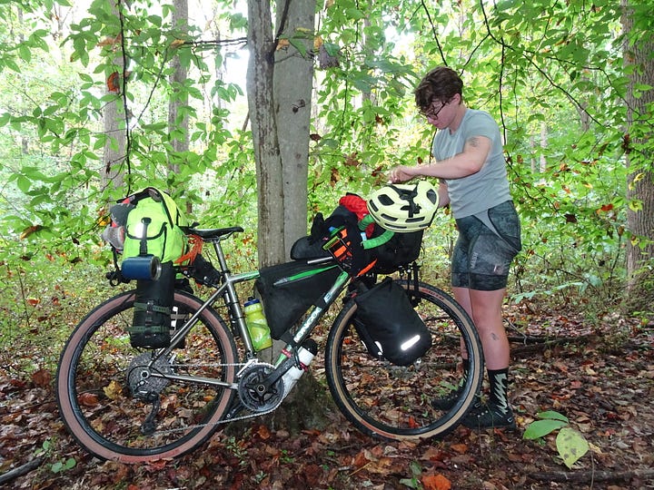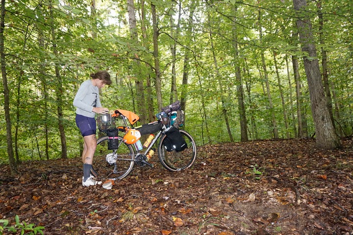 If you’re turned away from an unreserved campsite at a state park due to “wasp danger,” you can ride a half-mile away to stealthily pitch your tent in a permitted hunting area. You’ll hope your tent is brightly colored enough to fend off rogue gunmen, and you’ll sleep fitfully as every animal sound imaginable emerges from the surrounding woods during the night.
