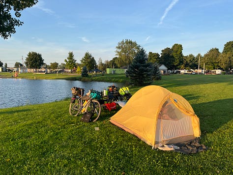 If you’re riding in Quebec, you can look out for friendly bikepackers from Montreal who will encourage you to camp wherever you are when the sun sets—Canadians don’t have guns to run you off their property. You’ll take this advice to heart and set up in a sparse ring of trees beside a small farm, where you’ll wake up to the thick morning dew soaking through your tent and all your belongings.