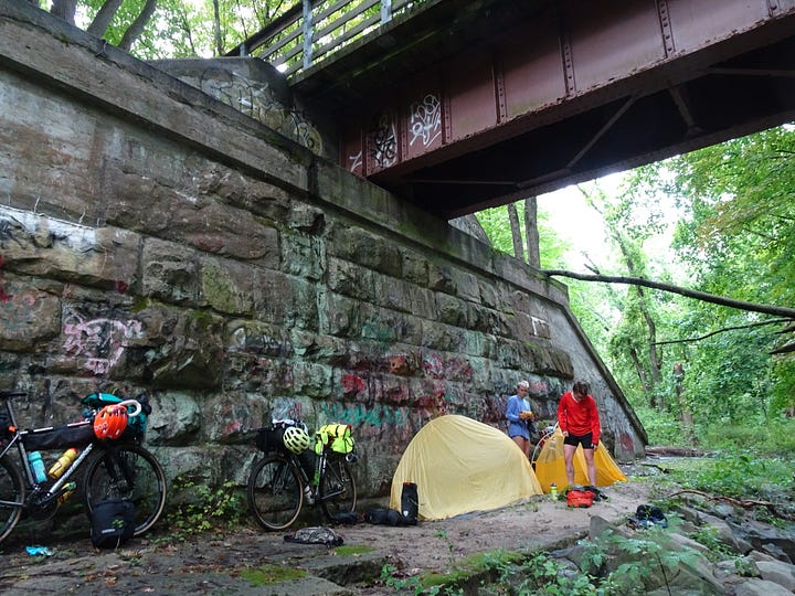 If you’re riding on bike paths, you can keep an eye out for pedestrian bridges, which you’ll scramble beneath at sunset to set up camp. If you have the foresight to put your bike under the shelter of the bridge before bed, some of your belongings may not be totally soaked by the storm that rolls through in the middle of the night.