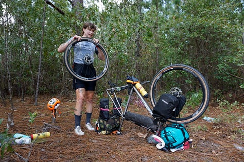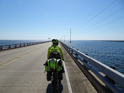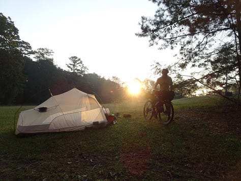 In the mornings (after coffee) my mind feels buoyant and elastic. I wonder what my friends are doing and if any of them are also riding their bikes right now. Start a mental list of all the words I’d use to describe the surrounding environment. Soupy, languorous, overgrown, muggy, dilapidated, fecund, lush, bucolic, miry, festering. Remember all the ecosystems I’ve biked through, try to name them. What’s the difference between a swamp and a bayou? A bog and a marsh? Think about what I’ll write in the next newsletter. Does anyone actually read these things?