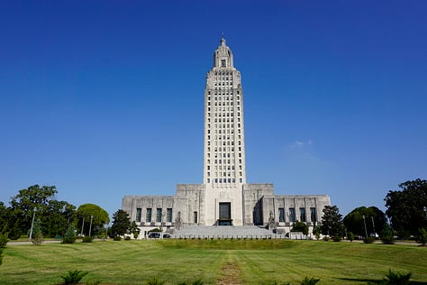 Border count: North Carolina (Chapel Hill; Greensboro) → South Carolina (Columbia) → Georgia (Augusta; Atlanta) → Alabama (Birmingham; Tuscaloosa) → Mississippi (Jackson; Natchez) → Louisiana (Baton Rouge; New Orleans)